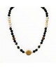 Ένα δυναμικό και κομψό κολιέ που συνδυάζει τη φωτεινότητα των μαργαριταριών με τη γήινη ένταση του χρυσού οψιδιανού και τη ζεστή λάμψη του ματιού τίγρης, ολοκληρωμένο με επιχρυσωμένο ασήμι 925. Ένα κόσμημα με χαρακτήρα, προστασία και διακριτική πολυτέλεια.