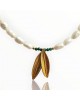 Εκλεπτυσμένο κολιέ με μαργαριτάρια γλυκού νερού, φυσικό μαλαχίτη και διακοσμητικό στοιχείο φύλλων ελιάς σε επιχρυσωμένο ασήμι 925. Ένα κόσμημα με έντονο συμβολισμό, που συνδυάζει κομψότητα, προστασία και εσωτερική ισορροπία.