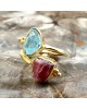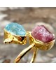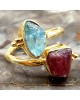 Ασημένιο 925 και επιχρυσωμένο με 18k ανοιγόμενο δαχτυλίδι με ακατέργαστους αυθεντικούς λίθους Ακουαμαρίνας και Ρουμπίνιου.